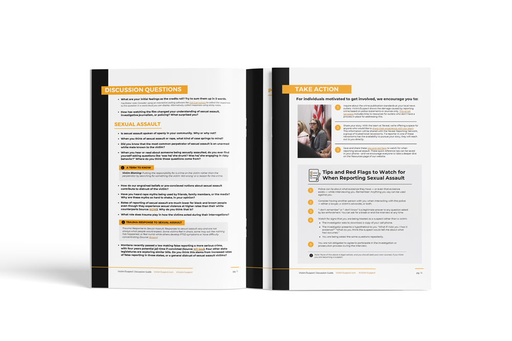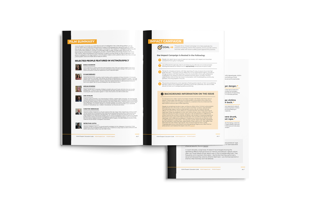Developed for screenings of the documentary Victim/Suspect and conversations that follow, our discussion guide equips audiences with tools to confront the troubling reality of sexual assault survivors being criminalized after reporting. Featuring thematic questions, background on rape myths, and strategies for trauma-informed conversation, it’s designed to foster honest dialogue, challenge harmful biases, and support systemic change in policing, journalism, and advocacy.