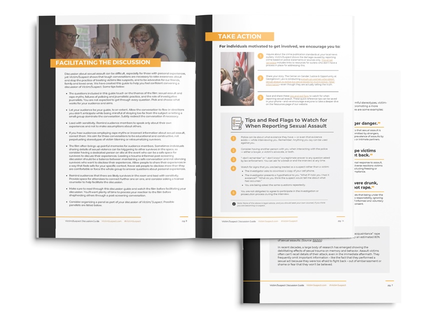Developed for screenings of the documentary Victim/Suspect and conversations that follow, our discussion guide equips audiences with tools to confront the troubling reality of sexual assault survivors being criminalized after reporting. Featuring thematic questions, background on rape myths, and strategies for trauma-informed conversation, it’s designed to foster honest dialogue, challenge harmful biases, and support systemic change in policing, journalism, and advocacy.